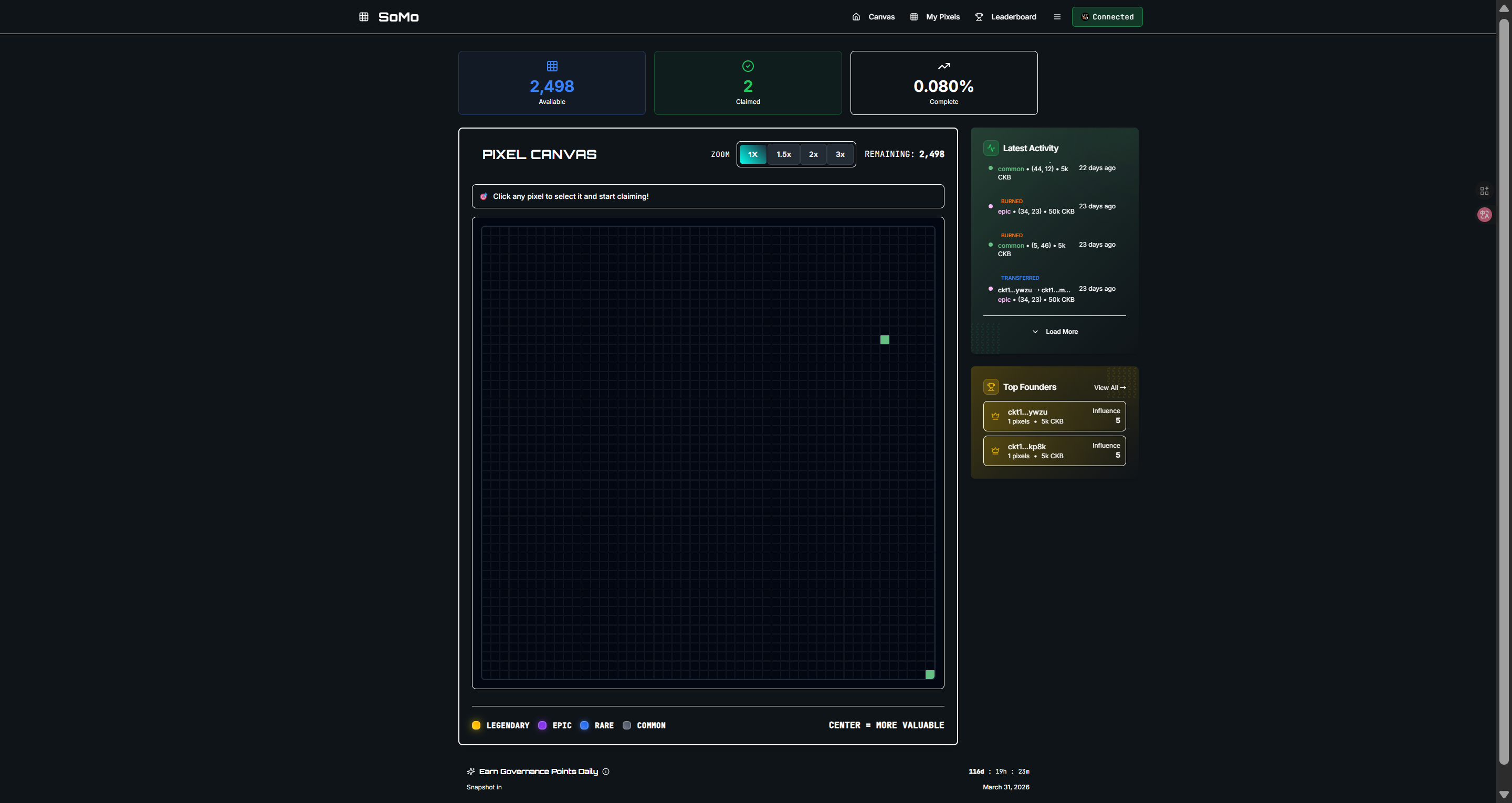 SoMo - Pixel Territory 是由社区开发者 Telmo 发起的一款游戏化像素领地应用,旨在利用 CKB 原生特性与 Spore 协议探索消费级应用的可能。