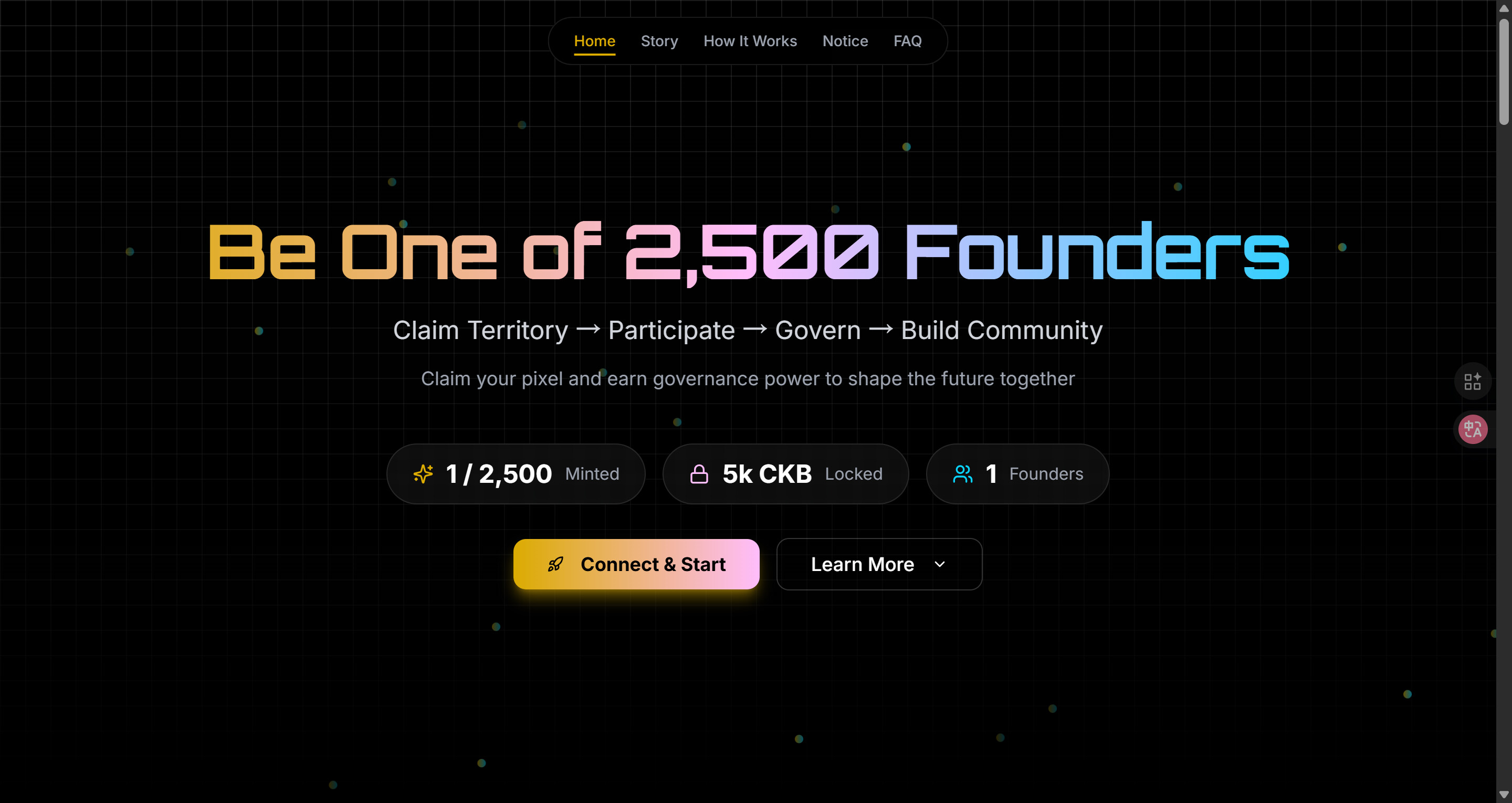 The project originally planned to deliver a 50×50 testnet MVP by October 24, 2025, and to simultaneously conduct seed user testing to validate the economic model under a 1,000–100,000 testnet CKB lockup range. The technical portion will be completed and delivered as scheduled on November 7, 2025. Although there were some activities on user testing and community building, they failed to form an effective user acquisition and feedback loop or produce a test report, so the intended economic model validation goal was not achieved.