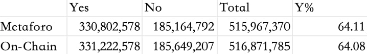 根据 Metaforo 在投票截止时的统计结果,本次投票结果为通过。赞成率 64.11%,总投票权重 515,967,370 CKB(Yes 330,802,578,No 185,164,792)。