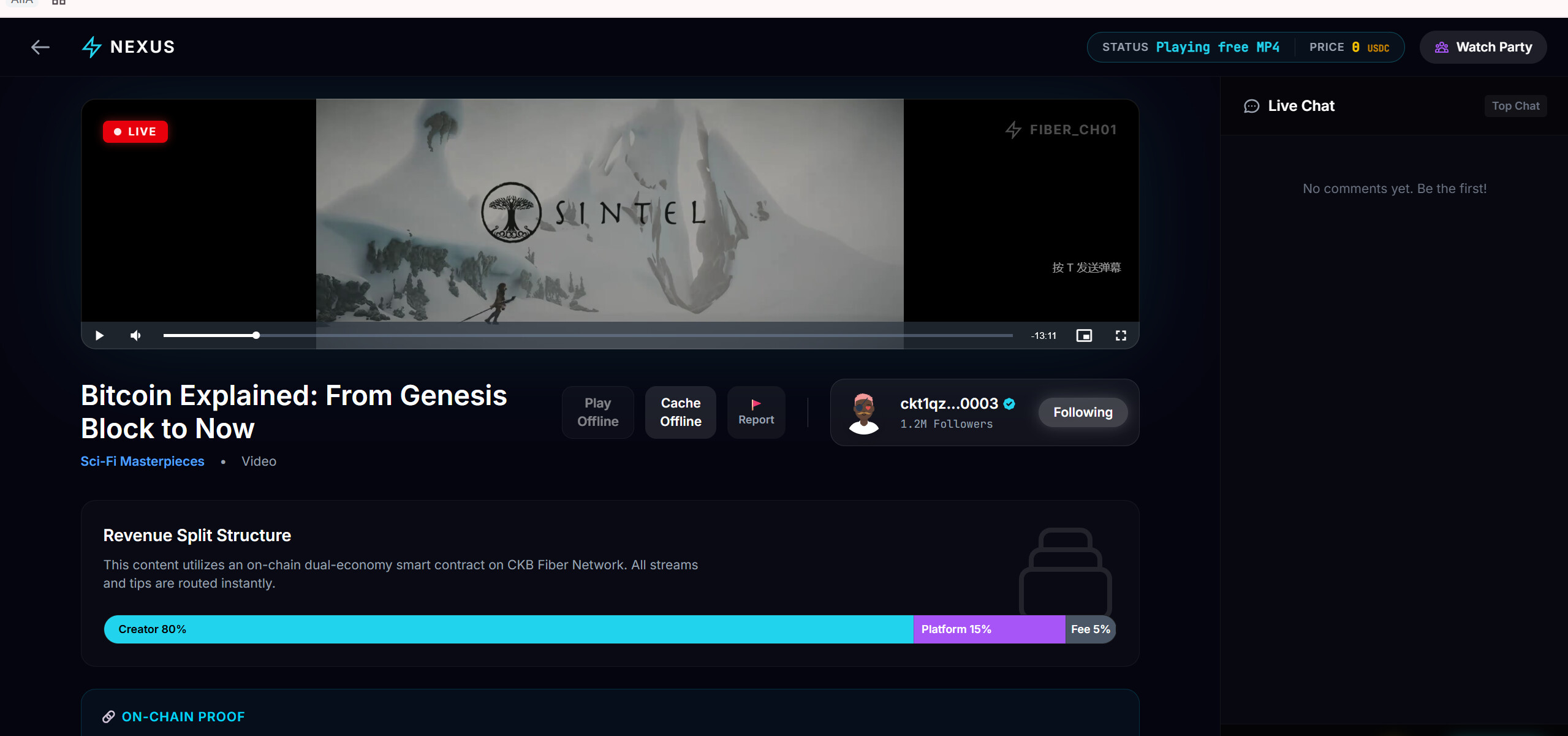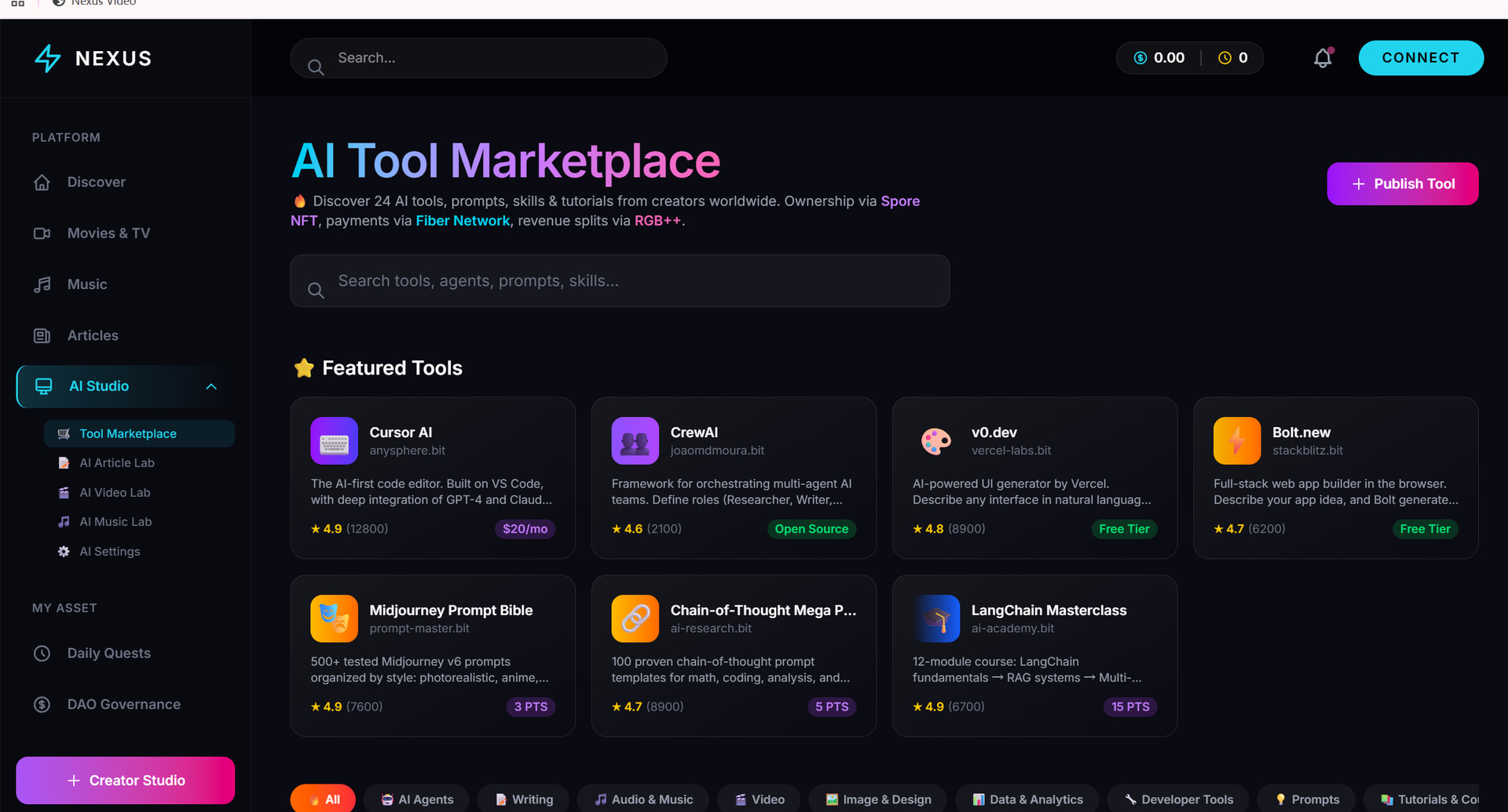 Nexus 是一个生产级全栈去中心化内容平台,融合了 YouTube/Spotify/Medium 的用户体验与 CKB 区块链的所有权和支付基础设施。