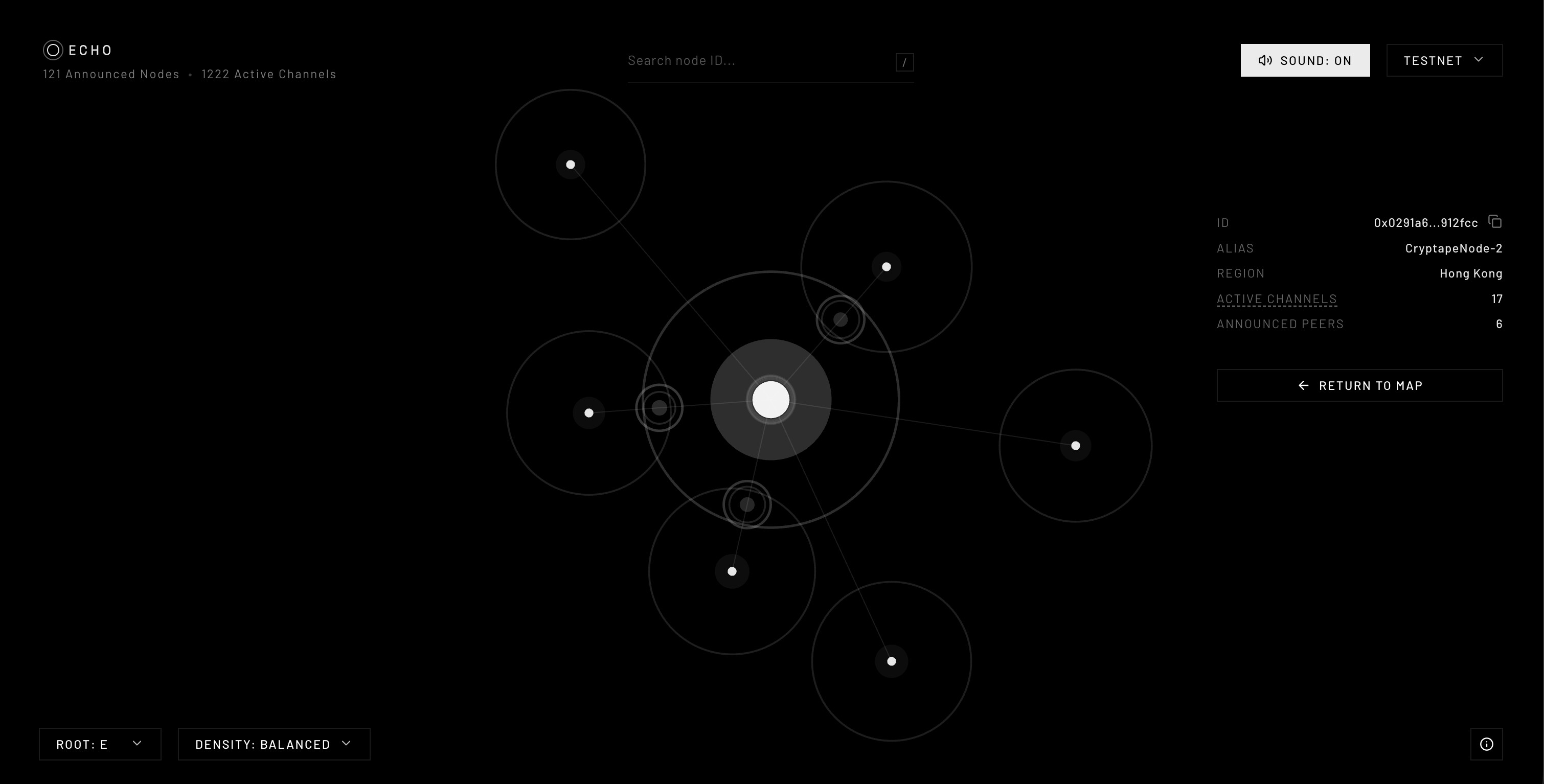 All pitches are mapped to a pentatonic system, so the sound stays mostly harmonic. You can also adjust the root note and density using the controls in the bottom-left corner. When channel events happen — such as channel openings, updates, or closures — Echo responds with special sonic cues.
