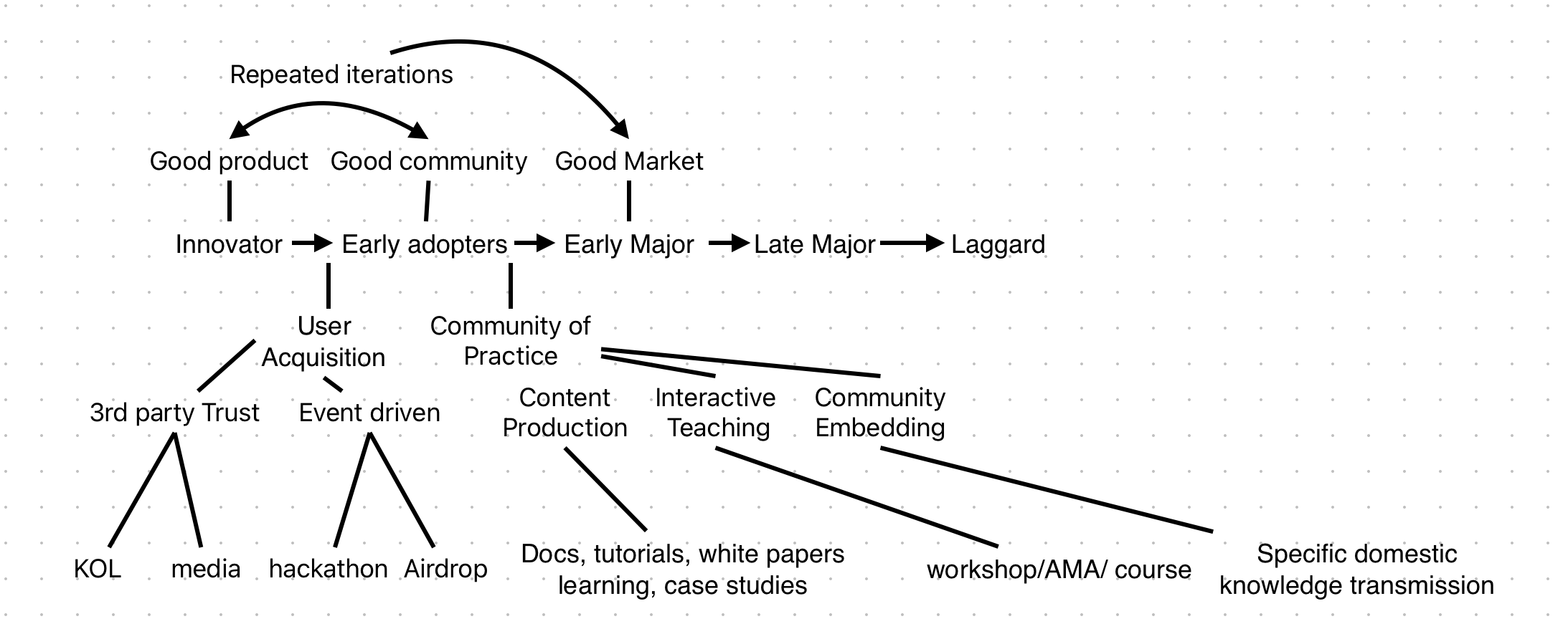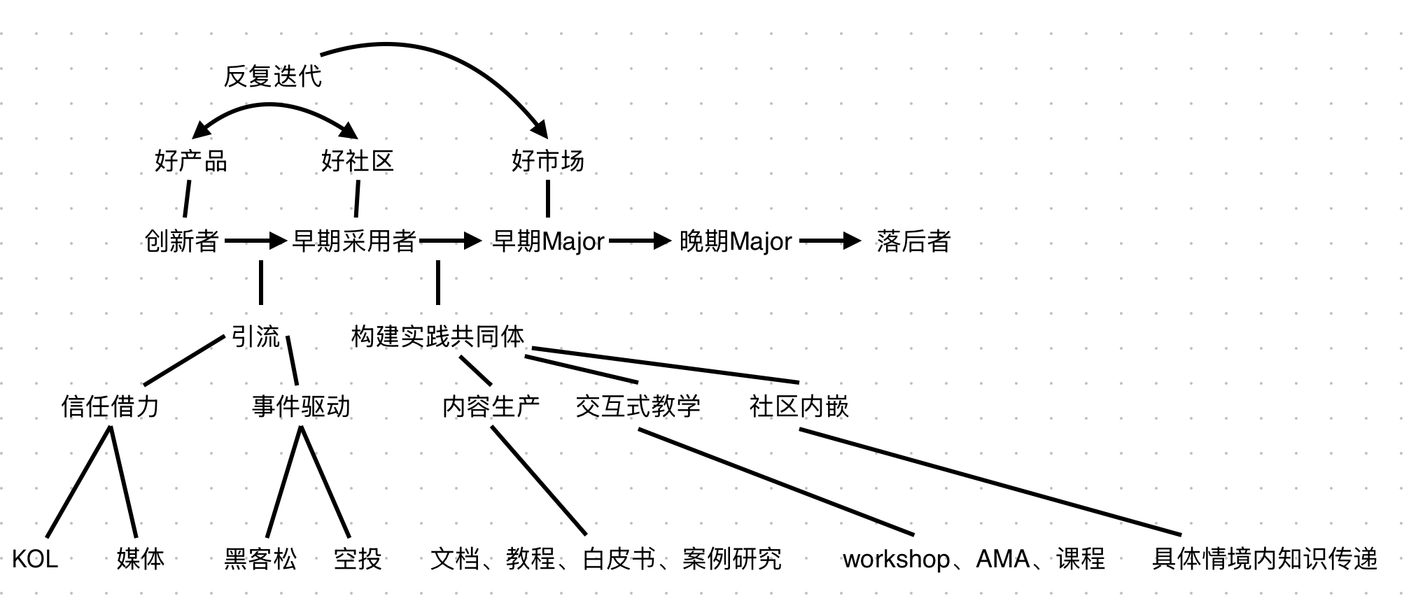 布道(但我不太喜欢这个词,honestly),我更愿意用构建实践共同体(Communities of Practice),是从早期采用者向早期Major传播时最关键,核心是建立共享的语言体系和概念框架,然后促进产品的迭代,变成好产品,同时社区变成好社区,一起推进到好市场,传播到早期Major