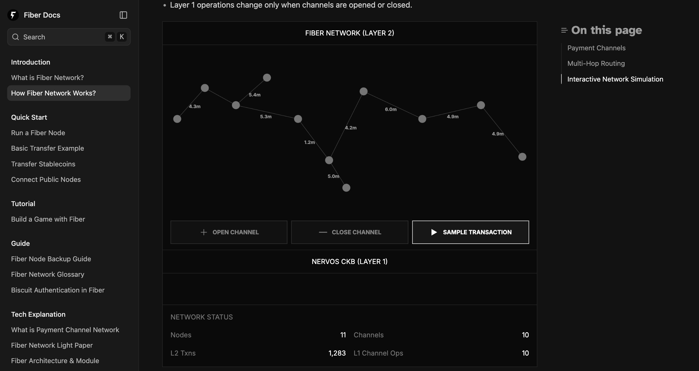 Interactive Network Simulation: It is essentially a redesign of Yukang’s earlier simulation demo, now integrated directly into the documentation experience. Through this simulation, users can get a more intuitive understanding of how Fiber works: how channel opening and closing are reflected on Layer 1, and how transactions are routed across the Layer 2 network before eventually reaching the recipient.