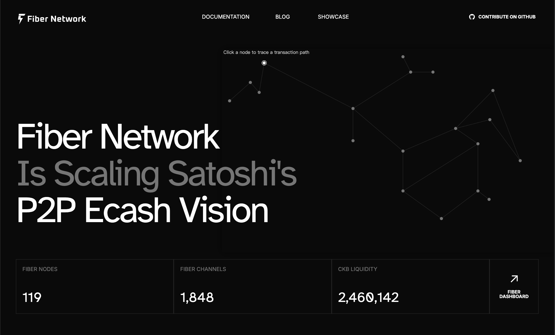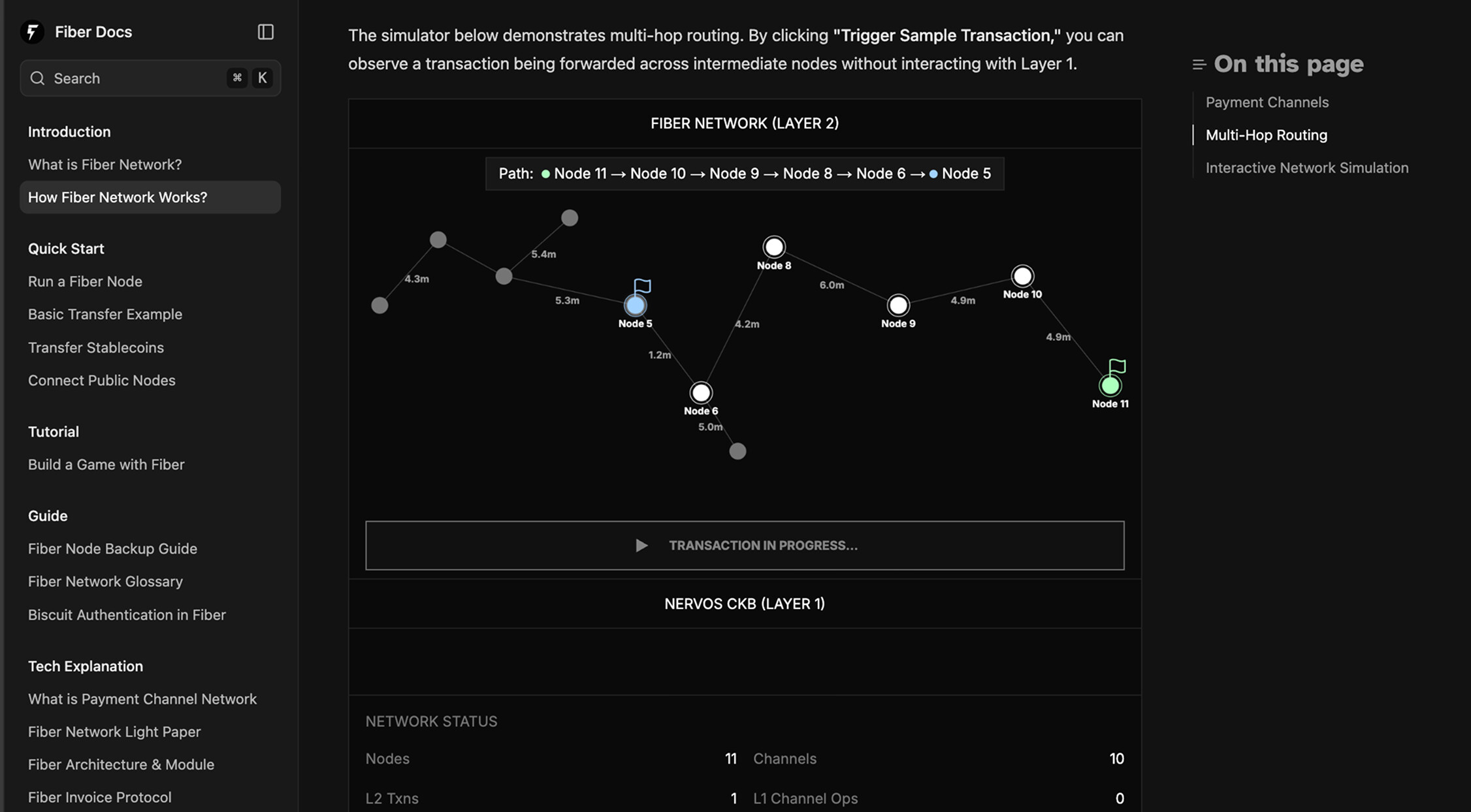 - Interactive Hero: Users can click a node to trace a transaction path across the graph, giving a lightweight visual introduction to Fiber’s multi-hop routing capability.