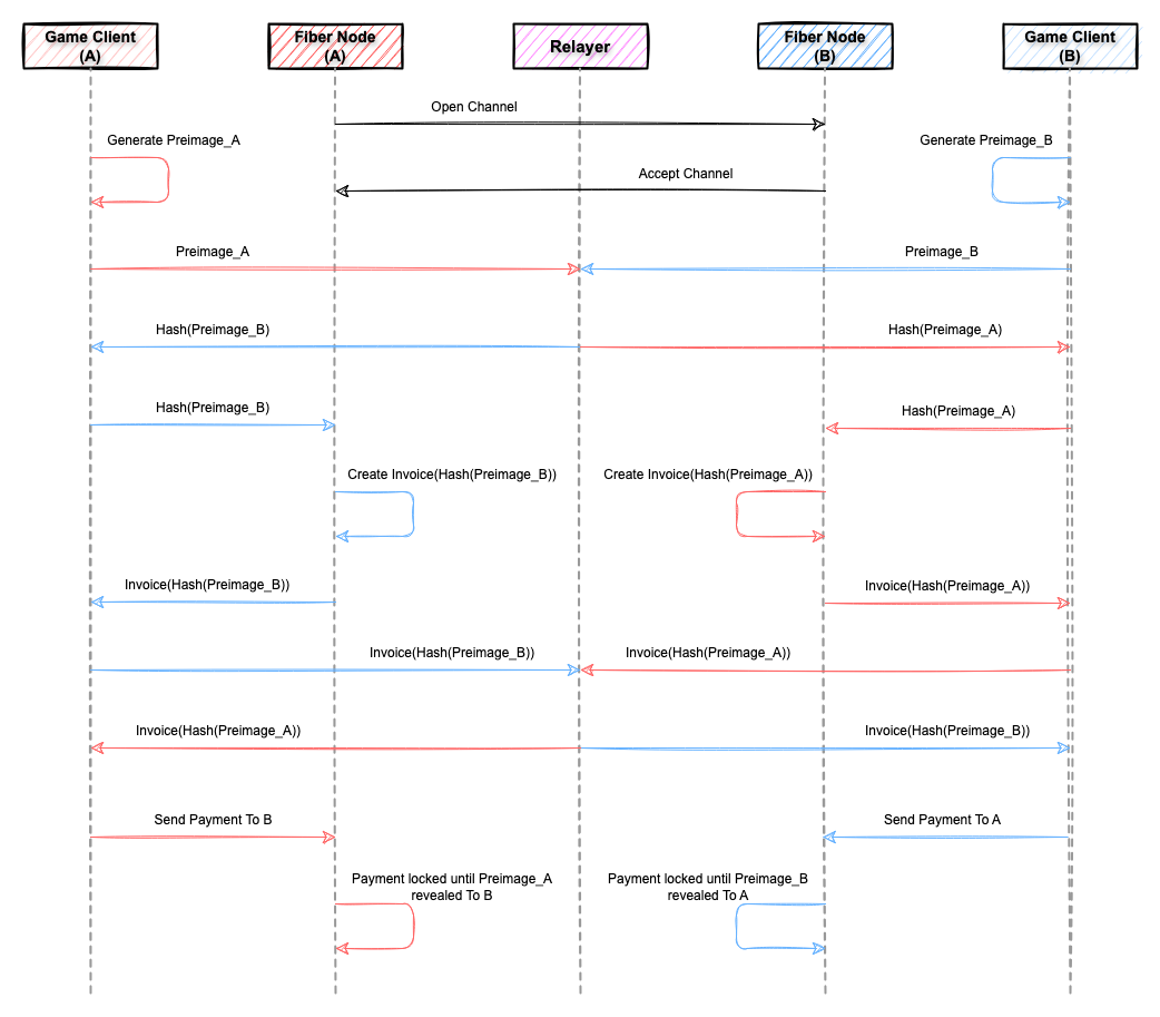 在对战开始前,对战双方需创建 Fiber 通道并将约定好的博弈资产锁定到通道中,资产锁定的方式采用 Fiber 的 PayToPaymentHash 技术,即基于 Preimage 的 Hash 而不是 Preimage 原象创建 Invoice,此时完成支付的 Invoice 处于 “挂起” 状态,待提供 Preimage 原象后这笔支付才正式计入账本