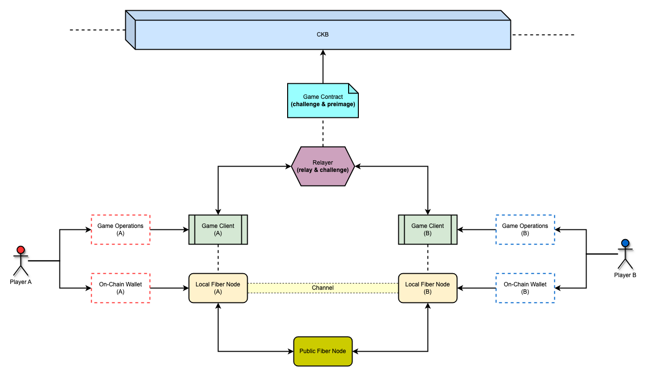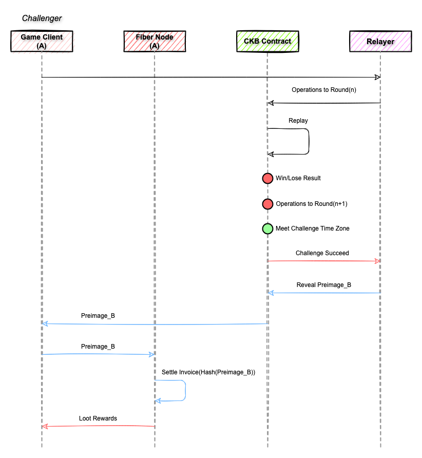 CKB 合约包含了游戏引擎代码,可重放所有游戏指令,当玩家 A 取得胜利后,客户端会将储存在本地的所有操作指令发送给 CKB 合约进行重放,在重放完毕后,如果游戏状态显示为玩家 A 胜利,则 Relayer 将向合约揭示玩家 B 的 Preimage 原象,玩家 A 从链上获取到 Preimage 原象后,可在自己的 Fiber 节点里解锁被玩家 B 挂起的支付,从而获得回报