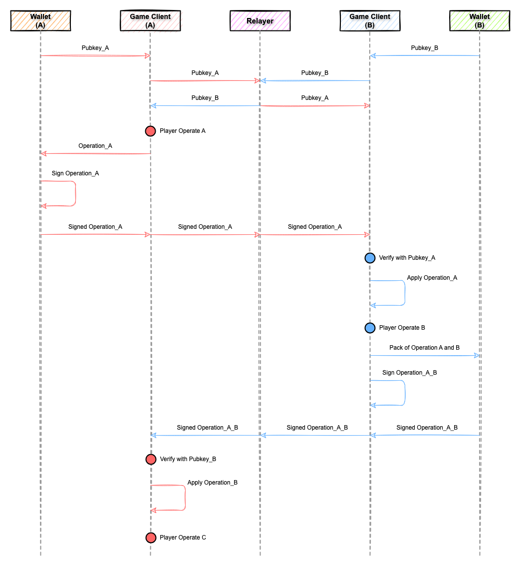 和简单的指令交换比起来,上述交换逻辑要求对战双方事先交换手中的公钥,然后每次发送游戏操作指令前都需要对指令进行签名,将指令数据连同签名一块儿发送,这样对手方收到指令后可以通过手上的公钥验证数据的正确性