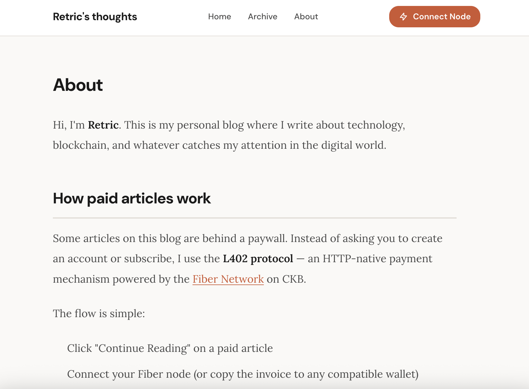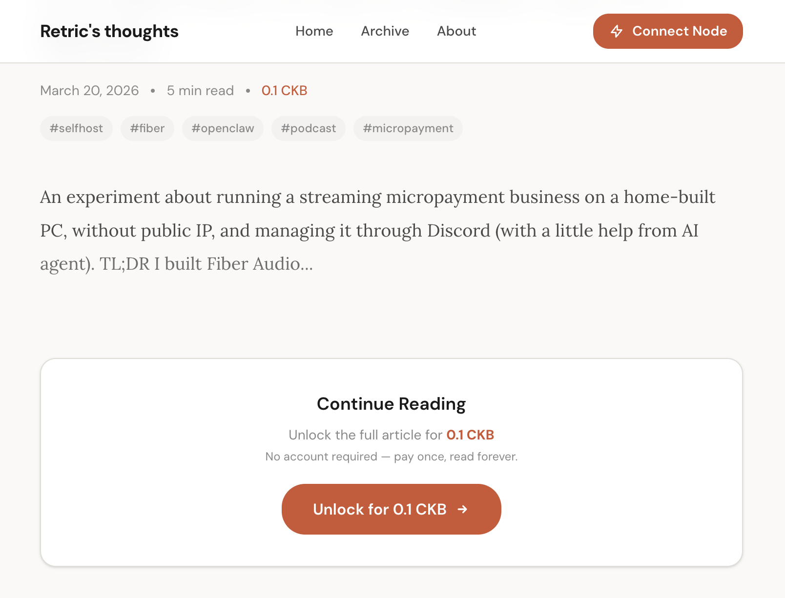 Hey everyone! I recently built an simple L402 protocol implementation on top of Fiber Testnet, consisting of a reusable SDK and a paid blog demo application. I’d like to share the ideas here — feedback and discussion are very welcome!