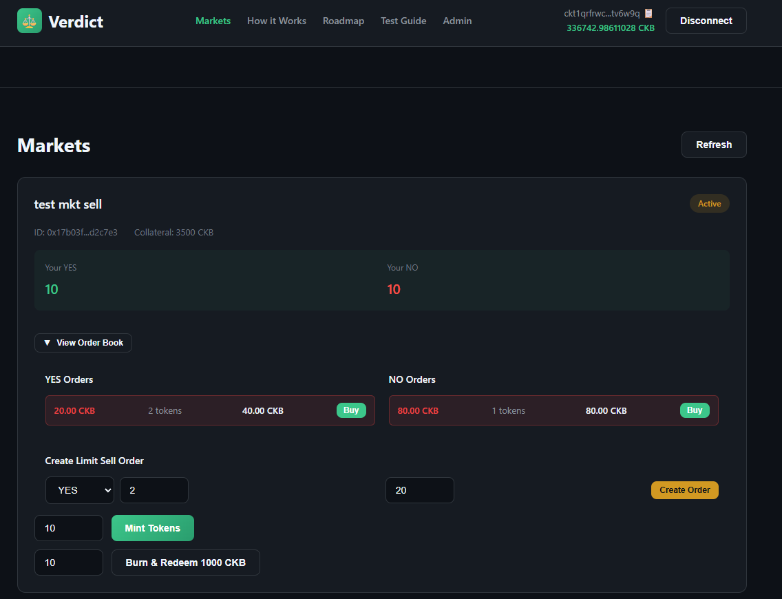Link for testing (WIP) Verdict - Prediction Markets on CKB