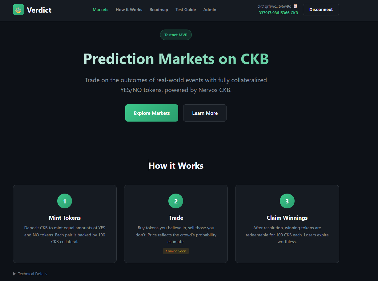 With the rise in popularity of platforms like Polymarket and Kalshi, Verdict is a prediction market allowing people to trade on the outcomes of real world events, built on CKB. The creator, @Methemeticz, has deployed an early version of testnet and is continuing to add core features to reach an MVP. Currently, creation of new markets, minting and order book trading of YES/NO tokens is possible.