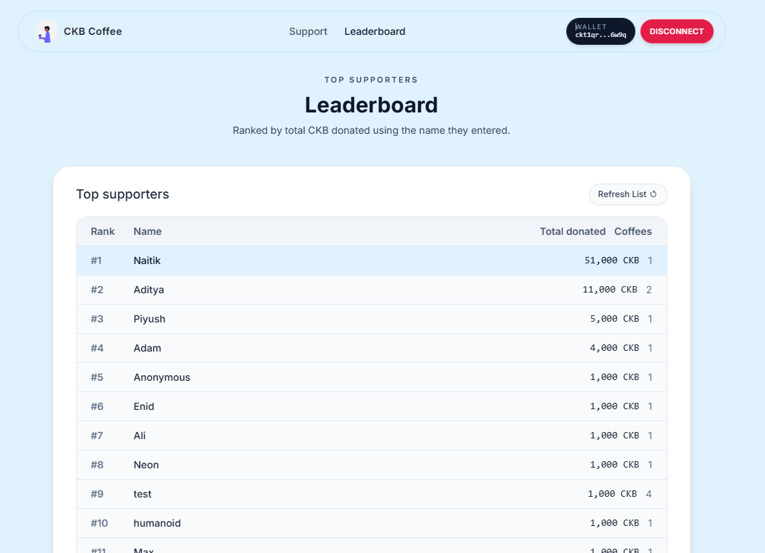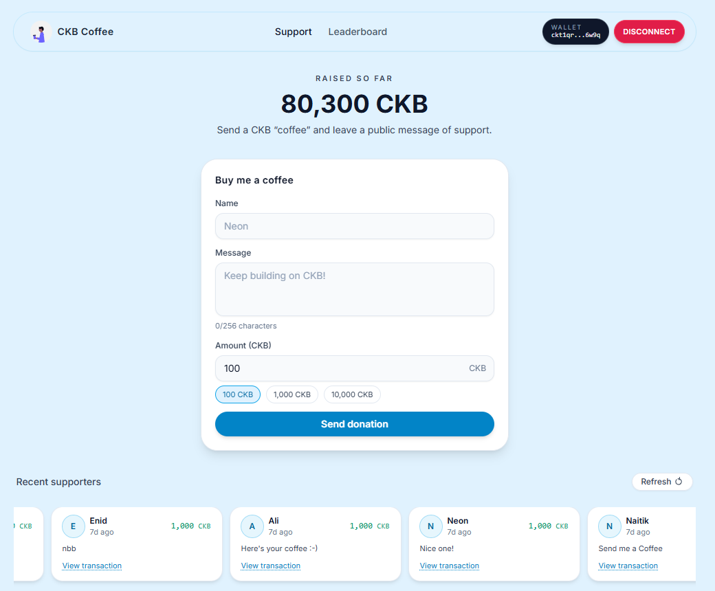 Buy me a Coffee - This is an early patreon or crowdfund style application, built by Aditya, allowing users to donate CKB and offer messages of support. This can be developed further, enabling users to create their own pages, as well as creating a hub and dashboard to view all available pages. Testnet link