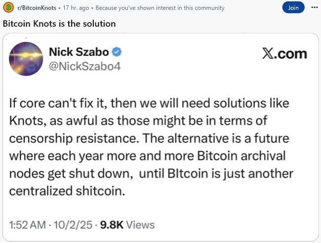 Separately, I don’t read Nick as endorsing Bitcoin Knots; I read him as worried that, if Bitcoin Core mishandles this, users will migrate to Knots—a client with more subjective, censorious rules. Where we differ is on the remedy: to avoid that outcome, the Bitcoin community should do a better job explaining why Bitcoin should allow data beyond BTC transfers and where any necessary filtering should occur, rather than rolling back the change, or adding more data-censorship (bad for long-term sustainability), just to quiet the controversy.