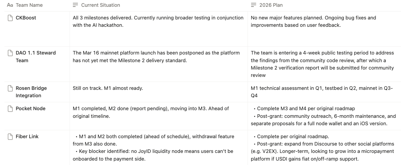 On the Community DAO side: As the DAO transitional period coordinator, I’ve compiled a descriptive overview of projects that passed DAO votes during my tenure, along with their 2026 plans. These are qualitative summaries rather than quantitative metrics, since most projects are still in active development. If you are really interested, I’d suggest asking directly in each project’s proposal thread, or hopefully, those project teams can share data here themselves. For projects that were approved before I took on this role, I have no info.