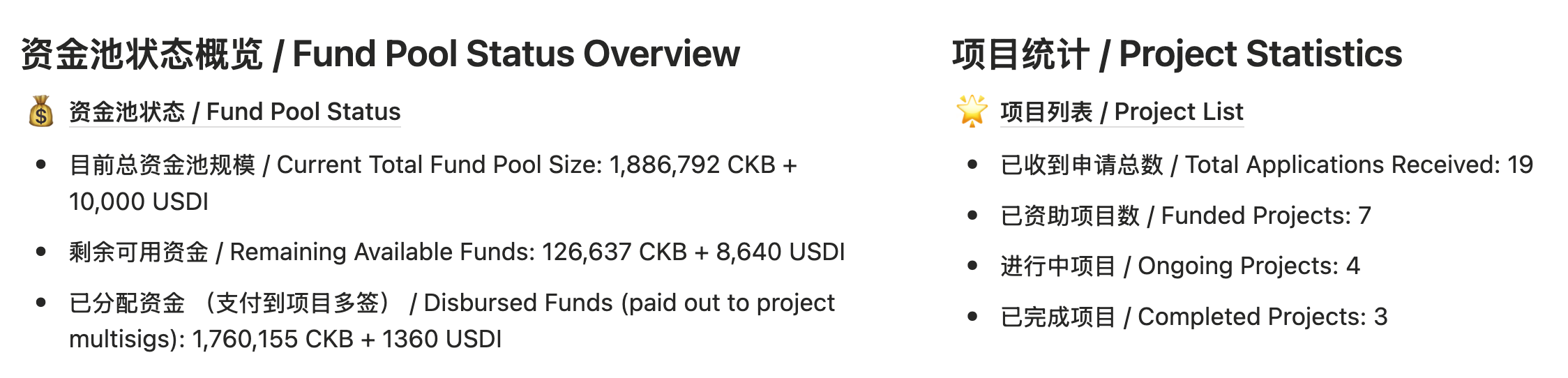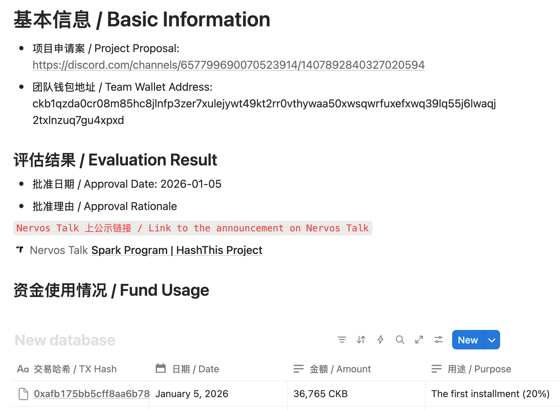 Detailed information and transaction hashes for all fund disbursements (including the initial 20% startup funds and subsequent payments) will be published on the Spark Dashboard, Nervos Talk forum, and the relevant channels of the Discord community.
