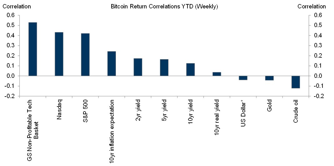 我看一张图,btc的价格走势跟不盈利的科技股高度一致,之前很多人配置比特币是因为它跟其他资产不太联动,现在感觉有点沦为了美股的山寨小票,纯靠资金、情绪驱动,没有了自己的独立叙事,与金价负相关。