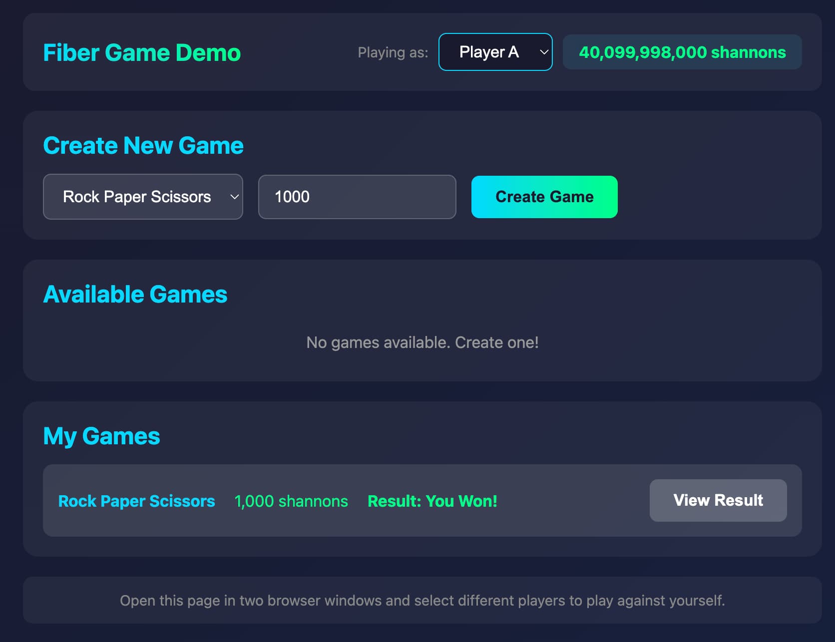 Supports Rock-Paper-Scissors and Guess the Number. Both players place bets through their own Fiber nodes. An Oracle uses adaptor signatures to cryptographically ensure that only the winner can unlock and claim the loser’s funds — no intermediary custody required at any point.