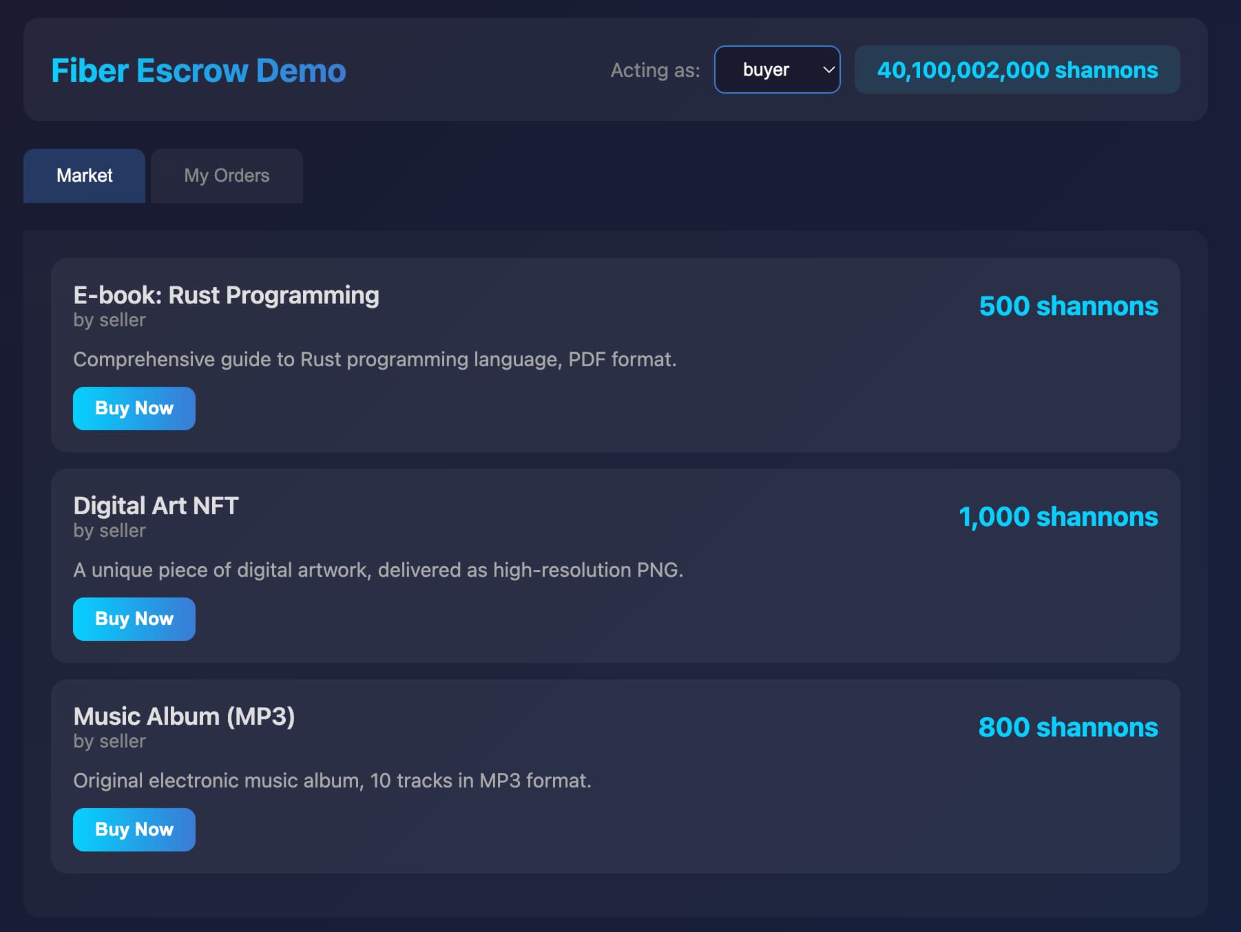 When a buyer pays, funds are locked in the Fiber Network via Hold Invoices — not in a platform wallet. The seller can only claim payment after confirming shipment. In case of a dispute, an arbiter steps in to resolve it. Funds never pass through the backend.